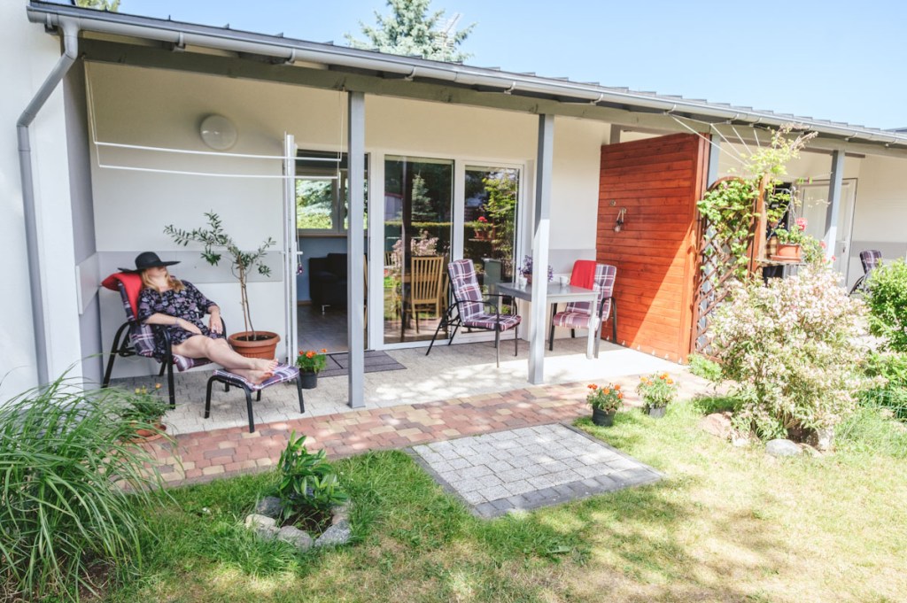 Idealne dla 4–5 osób: salon z wyposazona kuchnia, dwie sypialnie, łazienka i słoneczna weranda.