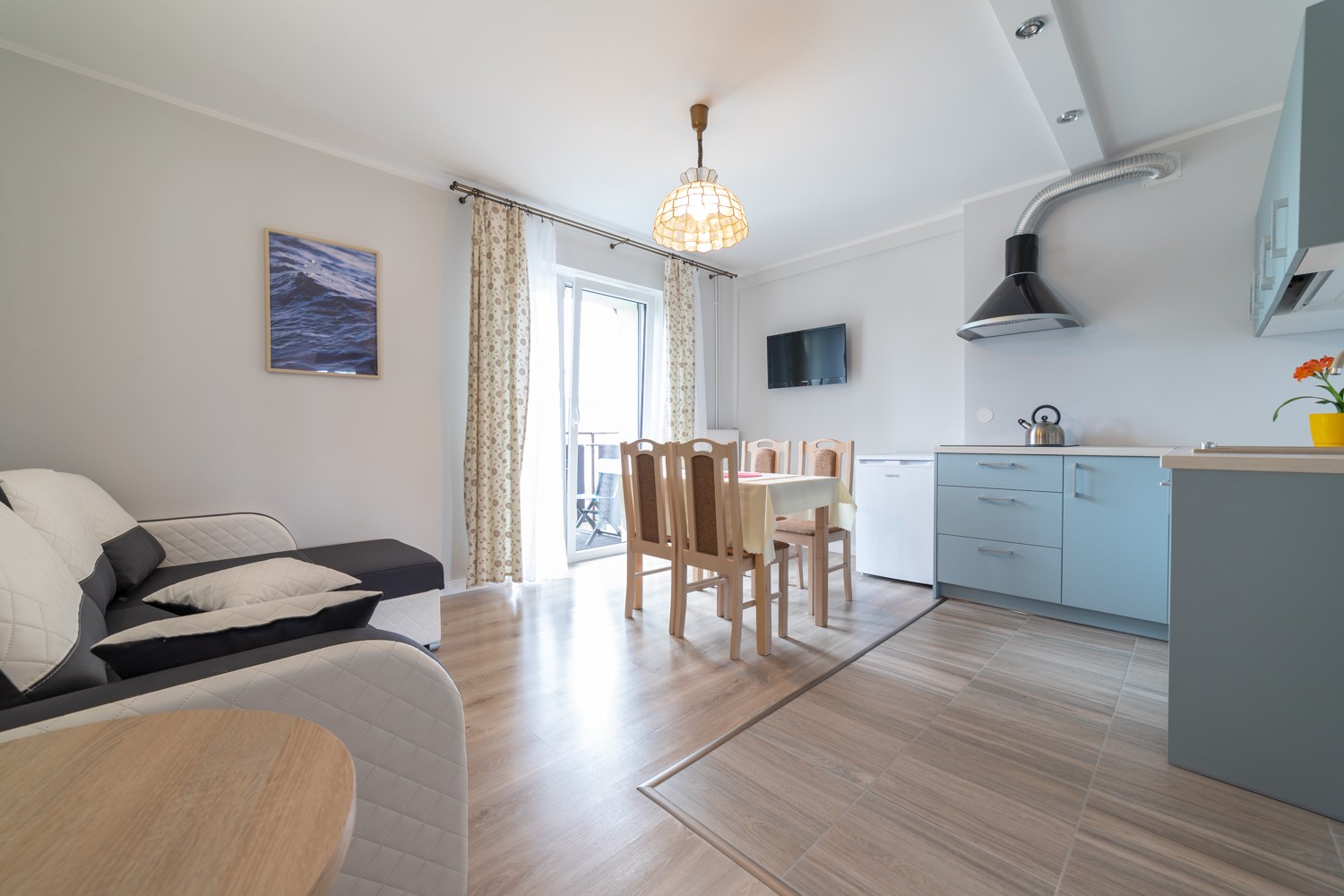 – salon z wyposazona kuchnia i balkonem rzymskim